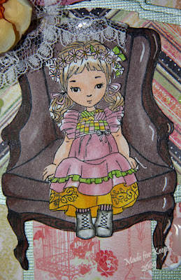 Sitting pretty in the center is Whiff of Joy Willow on WOJ's wing-backed chair. (Both colored with Copics) The lace that stretches across the card was carried into the flower as well, and an additional touch as a doily on the back of the chair.